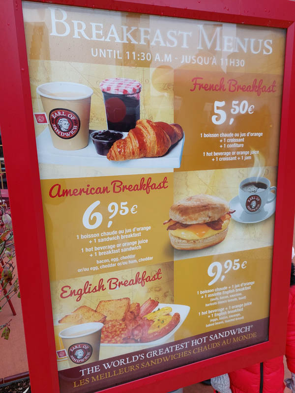 Vlak naast de PanoraMagique-ballon vind je het restaurant Earl of Sandwich, waar je zoals ze zelf zeggen The World’s Greatest Hot Sandwich kunt krijgen. In de ochtend kun je er tot 11.30 uur ook ontbijt nuttigen. Dit restaurant biedt een drietal opties aan als ontbijt, namelijk een French Breakfast, een American Breakfast en een English Breakfast. Het Frans ontbijt bestaat uit een warme drank of sinaasappelsap met een croissant en jam. Wanneer je kiest voor het Amerikaans ontbijt krijg je eveneens een warme drank naar keuze of sinaasappelsap met een warme ontbijtsandwich belegd met ei, bacon en cheddarkaas (of ei en cheddarkaas of ham en cheddarkaas). Het meest uitgebreide ontbijt is de Engelse versie. Hierbij krijg je namelijk een warme drank naar keuze, sinaasappelsap en een Engels ontbijt bestaande uit ei, bacon, een worstje, witte bonen in tomatensaus en geroosterd brood.