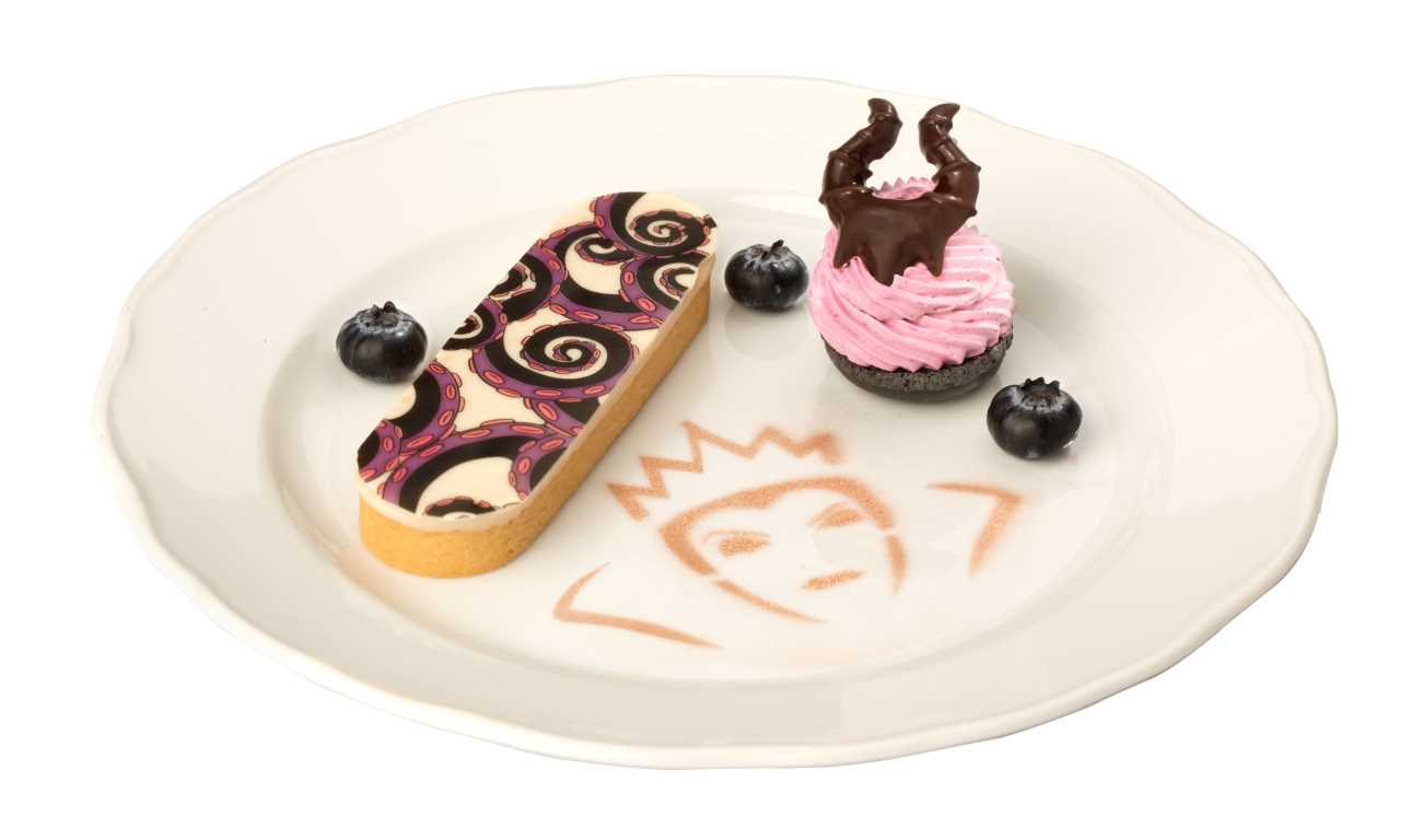 Het eten en drinken zal ook heerlijk stout zijn, denk maar aan de Disney Villains Plate die beschikbaar zal zijn in bepaalde table service restaurants. Kies een hartige vleesschotel gevuld met pompoen en "trompettes de la Mort" ("dodelijke" wilde paddenstoelen) overgoten met een "sauce diable" (duivelse saus) of het menu van de Boze Koningin van Sneeuwwitje dat een dessert bevat geïnspireerd op de beroemde giftige appel. Snacks zullen ook een paar trucs in hun mouw hebben, zoals spookachtige zandkoekjes met Cruella en Mickey, bekend als de "Sabl'Effrayant Mickey".