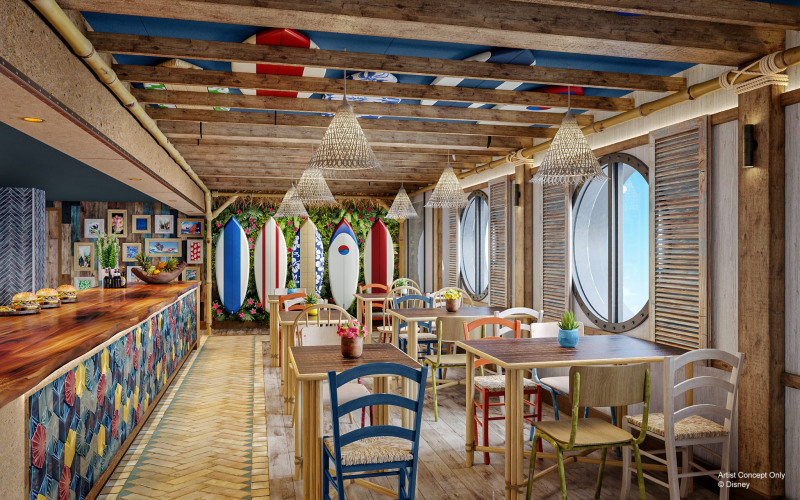 Taverna Portorosso: Een intieme en schilderachtige sportbar geïnspireerd op Pixar's *Luca*, waar gasten een drankje kunnen nemen, een wedstrijd kunnen kijken en kunnen genieten van het uitzicht op de levendige boulevard eronder.