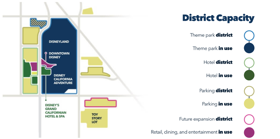 Van Cars Land en Star Wars : Galaxy's Edge tot de nieuwe Pixar Pals-parkeerstructuur, Disney heeft de afgelopen twee decennia miljarden dollars geïnvesteerd in pretparkervaringen en infrastructuur. Hoewel Disney de ontwikkelingsrechten heeft en de wens heeft om in Anaheim te blijven investeren, is de ruimte om een geïntegreerd aanbod te ontwikkelen zeer beperkt. Zonder het verbreden van het toegestane gebruik binnen elk district of het slopen en vervangen van veel geliefde pretparkattracties, zijn verdere geïntegreerde ontwikkeling en investeringen in pretparken niet mogelijk.