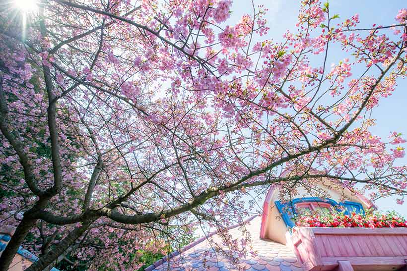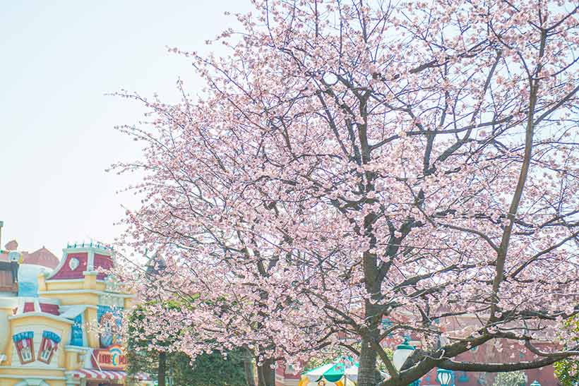 De eerste kersenbloesems in Tokyo Disneyland zorgen voor een heerlijk vroeg lentegevoel.