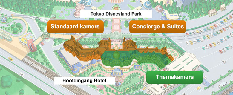 Afhankelijk van het kamertype bevindt een kamer zich in een bepaald gedeeld van het hotel. Onderstaande afbeelding geeft een overzicht van de verdeling binnen het hotel. De ligging van enkele kamers kan hiervoor licht afwijken. Disney's Cinderella kamers met Concierge service zijn gelegen aan de hoofdingangzijde.