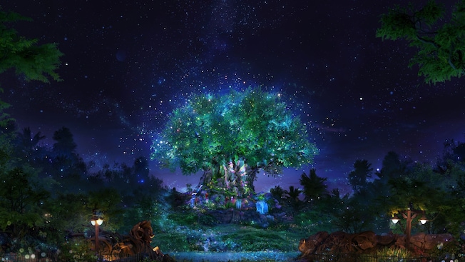 In Disney's Animal Kingdom Theme Park straalt een warm licht uit de Tree of Life terwijl vuurvliegjes samenkomen om de magie van de natuur in te luiden.