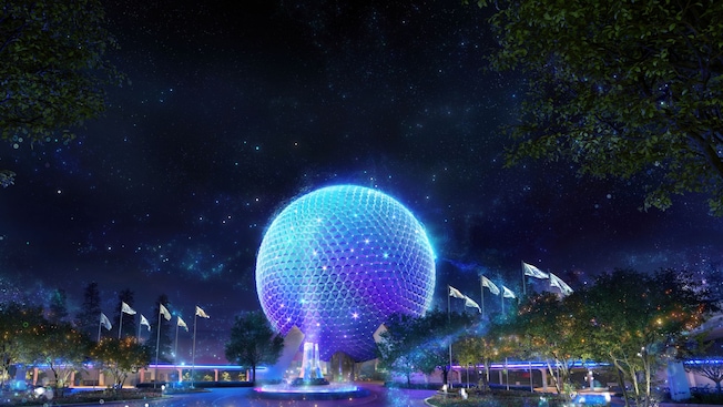 En in EPCOT schijnen nieuwe lichten over de reflecterende panelen van Spaceship Earth, die met elkaar in verbinding staan als sterren in een nachtelijke hemel en een betoverend symbool van optimisme creëren. De permanente nieuwe verlichting van de iconische structuur zal ook na "The World's Most Magical Celebration" een bepalend kenmerk van het park blijven.