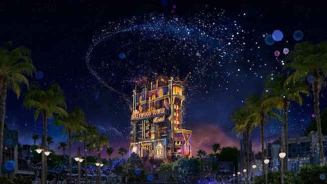 Het Hollywood Tower Hotel in Disney's Hollywood Studios wordt overspoeld met een schittering die de gouden eeuw van verbeelding en avontuur oproept.