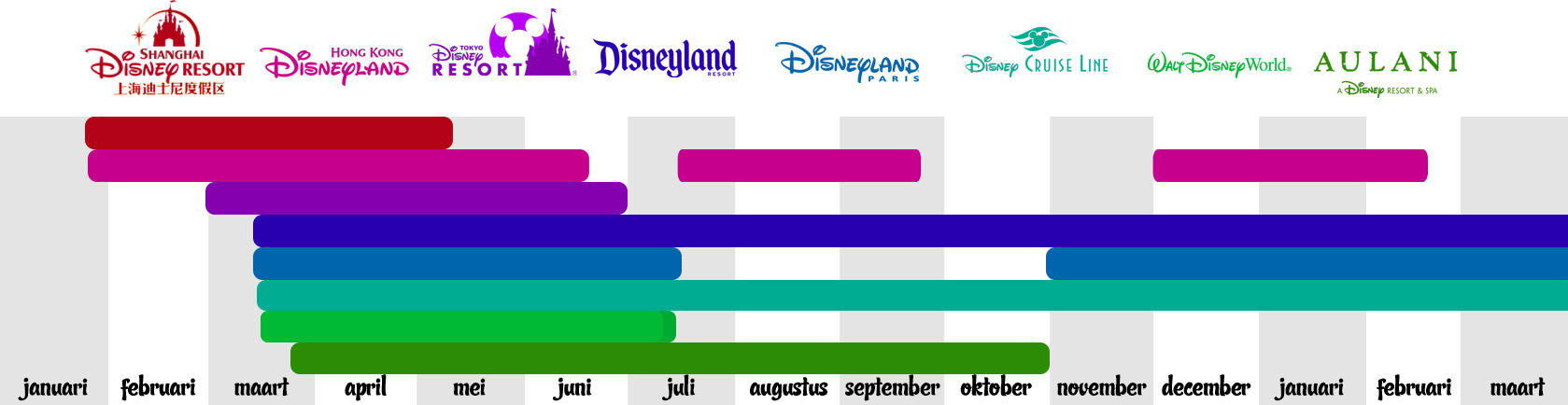 Om alles nog wat overzichtelijker te maken, hebben we alle data van alle Disney resorts en de Disney Cruise Line verwerkt in onderstaande tijdlijn. Zo zie je in een oogopslag wanneer welk resort open of dicht was.