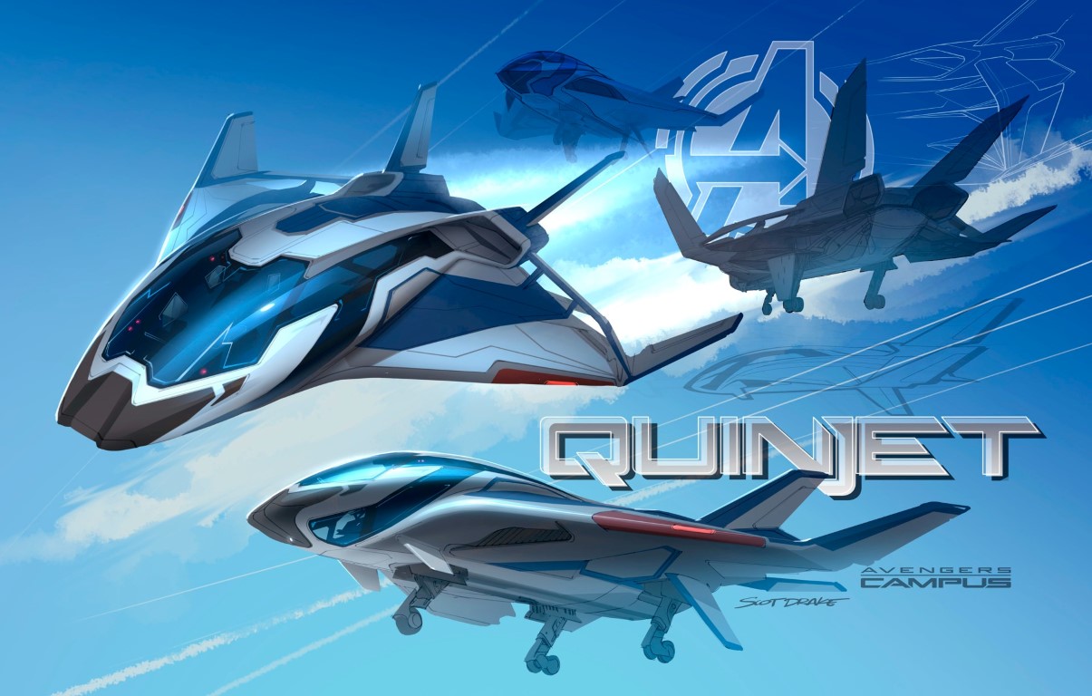 Eerst voorgesteld als een geavanceerd vliegtuigtransport gebruikt door Earth's Mightiest Heroes, zijn er verschillende Quinjet-ontwerpen geweest in Marvel-strips en het Marvel Cinematic Universe. Voor onze eigen Avengers Campus-versie wilden we echter een ambitieuze, toekomstgerichte esthetiek laten zien. Dus kwamen we met dit geheel nieuwe WDI-ontwerp. Maar om een jet op ware grootte te bouwen, moesten we extra technische expertise inbrengen, wat we deden door samen te werken met het Britse bedrijf UK Loco, een langdurige, vertrouwde partner van WDI Paris die al ongeëvenaarde technische input had geleverd voor meeslepende ervaringen zoals Toy Story Playland, Crush's Coaster en Ratatouille: L'Aventure Totalement Toquée de Rémy.
