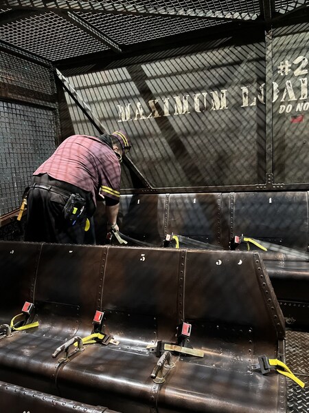 Cyril, nog steeds in het controlecentrum, zorgt ervoor dat de controleschermen, het geluid en de voertuigen goed werken. Van controleren of de apparatuur werkt tot ervoor zorgen dat de veiligheidsgordels in orde zijn, Cyril volgt nauwgezet zijn lijst met taken voordat hij de eerste lege wagen in beweging zet voor een test. Deze veiligheidsmaatregelen worden tegelijkertijd uitgevoerd door meerdere Cast Members op alle voertuigen van de attractie.
