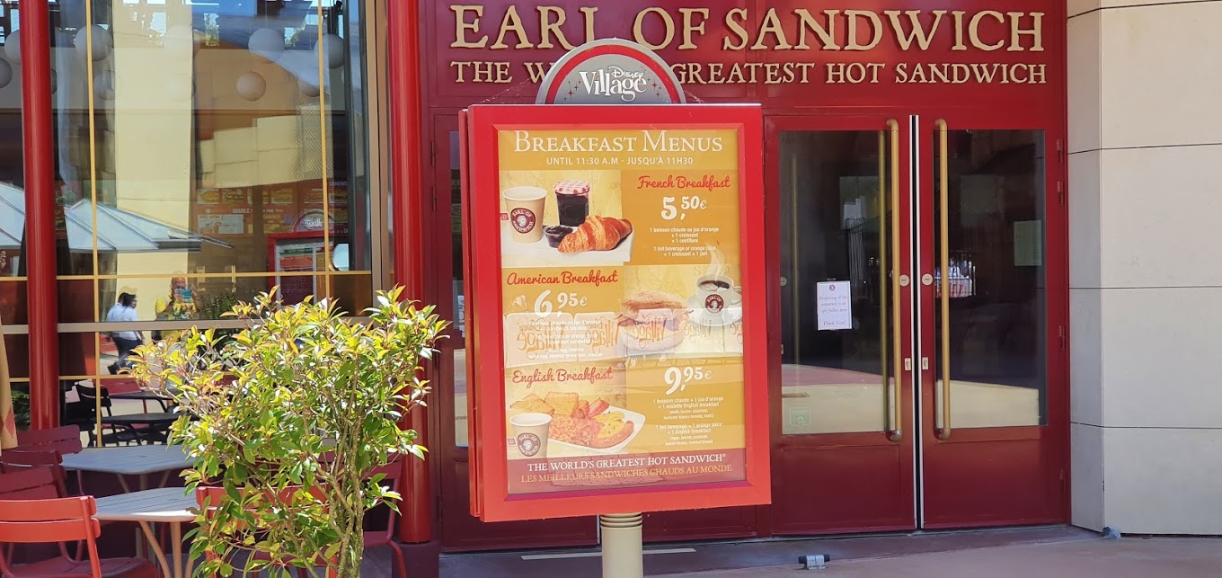 In de ochtend kun je tot 11.30 uur ook ontbijten bij de Earl of Sandwich. Hier vind je een drietal ontbijtmenu's. Hierbij kun je kiezen voor een Frans, Amerikaans of Engels ontbijt. Ideaal voor wie even snel wil ontbijten, voor een bezoekje aan de Disney Parken.