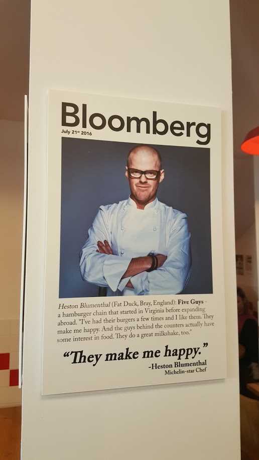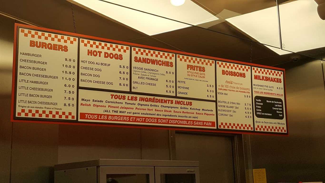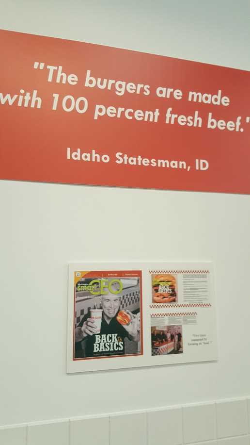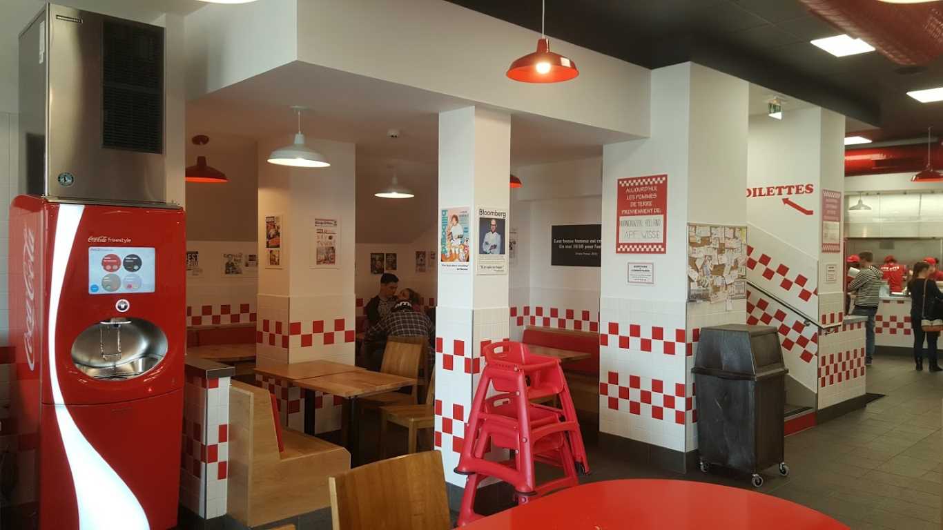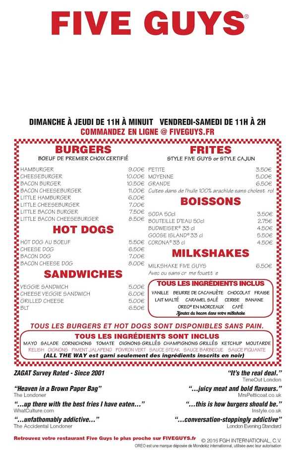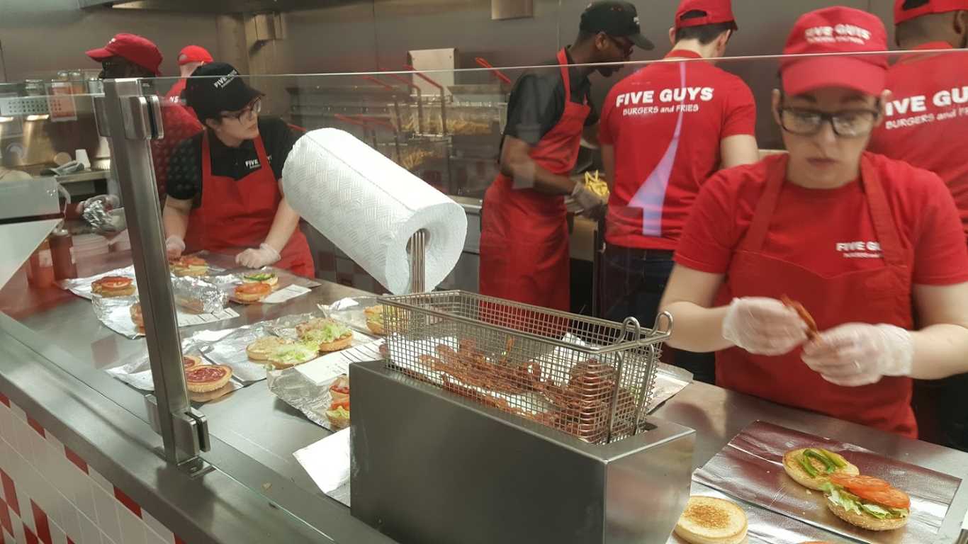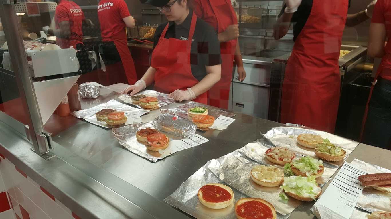 Bij Five Guys maken we kwaliteitsburgers van uitsluitend verse ingrediënten. Gasten kunnen 15 ingrediënten kiezen voor dezelfde prijs. Zo kan een eindeloos aantal verschillende burgers worden samengesteld (250.000 mogelijkheden). Bij Five Guys worden de knapperige frietjes elke dag vers gemaakt en kunt u kiezen uit hotdogs, milkshakes en maar liefst 120 verschillende dranken. De sfeer is rock, ontspannen en zonder kapsones.