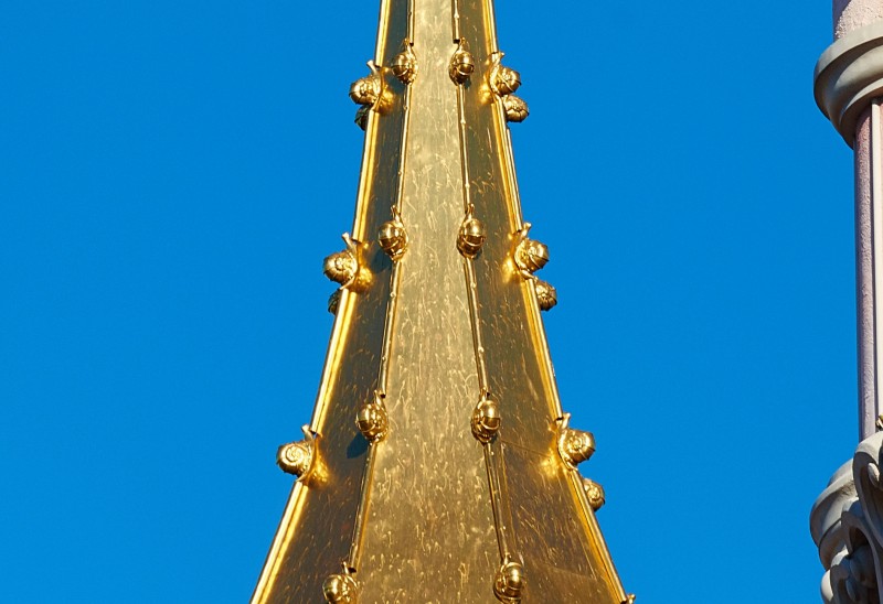 Op de twee met goud versierde torens zie je gouden slakken naar de top gaan - een kleine hommage aan een typisch Franse culinaire traditie uit Bourgondië!