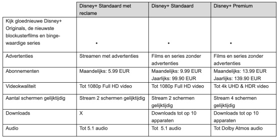 De prijs van dit abonnement gaat naar 13,99 euro per maand of 139,90 euro per jaar. Er komen ook 2 nieuwe abonnementsvormen Disney+ Standaard met reclame, voor 5,99 euro per maand en de tweede is Disney+ Standaard, dus zonder reclame, voor 9,99 euro per maand of 99,90 per jaar.